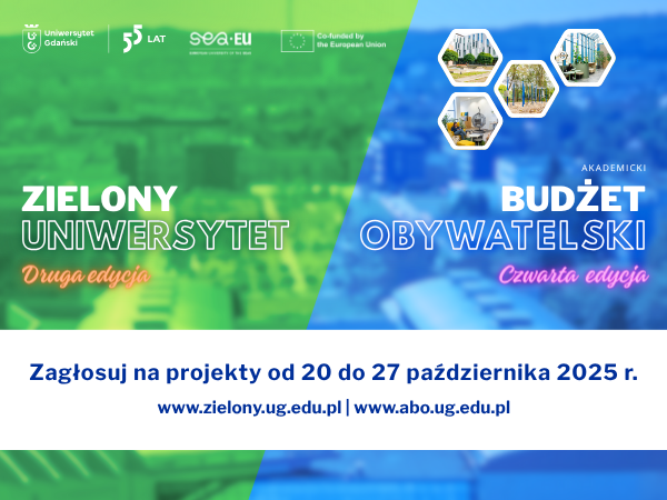 Nowe wspólne przestrzenie do nauki, pracy i rekreacji, podniesienie atrakcyjności wizualnej uniwersyteckich kampusów, a także dbałość o środowisko naturalne - rusza głosowanie w konkursach ABO UG i Zielony UG. Łączna pula środków w obu konkursach to 280 tys. zł. Głosowanie potrwa w dniach 20-27 października br. Zapraszamy wszystkich studentów, doktorantów i pracowników do współdecydowania o tym, jak będzie wyglądało nasze najbliższe otoczenie!