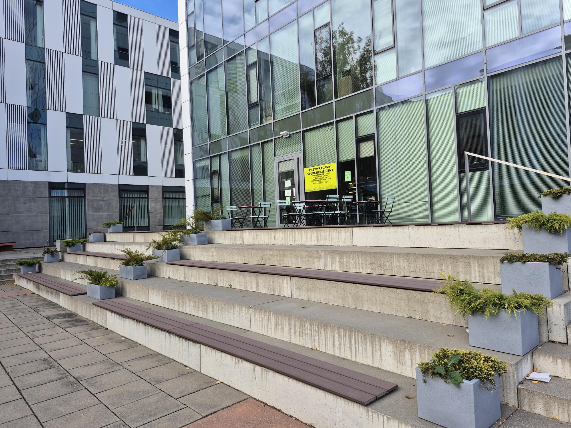 Spośród wybranych przez społeczność akademicką naszej uczelni projektów pracowniczych ABO UG 2024, ukończony został projekt autorstwa pani Aleksandry Hołomej dotyczący montażu na stopniach Placu im. Profesora Andrzeja Ceynowy siedzisk kompozytowych, a dzięki realizacji innego projektu zgłoszonego przez tę samą autorską do konkursu Zielony UG przestrzeń ta została również ukwiecona poprzez ustawienie na niej donic z niską roślinnością i kwiatów, stając się kolejną przyjazną strefą do wypoczynku na terenie kampusu.
