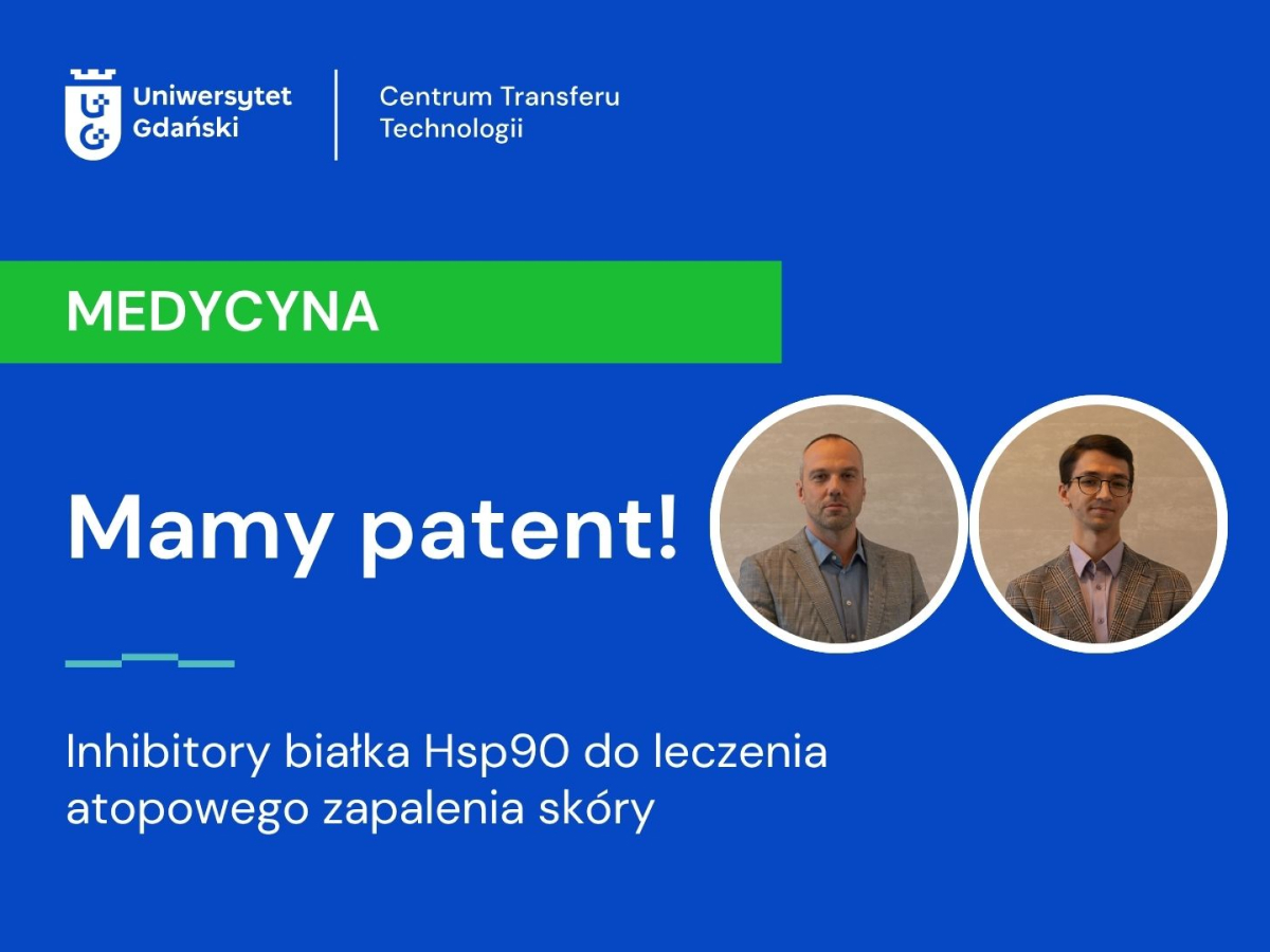 Prof. Stefan Tukaj z Wydziału Biologii UG oraz współpracujący z nim doktorant Krzysztof Sitko zaproponowali wykorzystanie dwóch dostępnych inhibitorów białka szoku cieplnego Hsp90 (stosowanych głównie w terapiach onkologicznych) w leczeniu atopowego zapalenia skóry. „Blokując Hsp90, wyciszamy mechanizmy podtrzymujące stan zapalny” - wyjaśniają istotę działania terapii autorzy wynalazku „Inhibitory białka Hsp90 do zastosowania w leczeniu atopowego zapalenia skóry u ludzi”. Wynalazek uzyskał ochronę patentową Urzędu Patentowego RP.