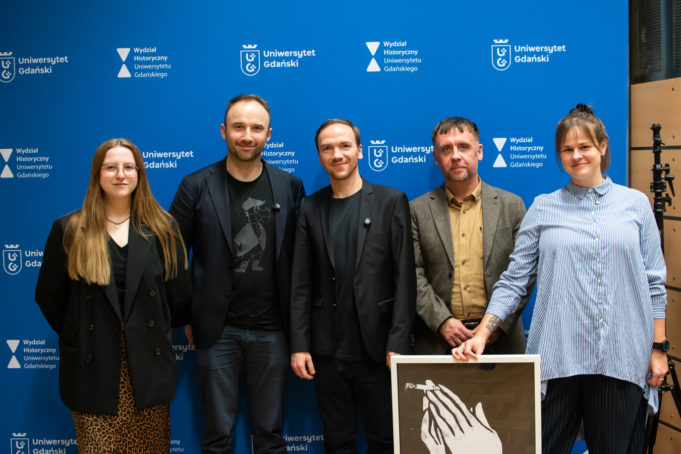 Reżyser Jan Komasa w towarzystwie osób z ACK i DKF na tle ścianki UG; fot. Jakub Kosatka