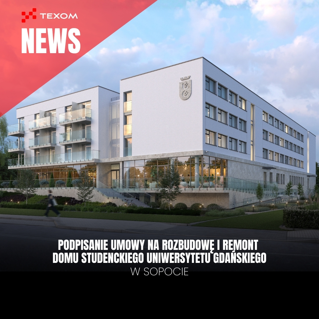 Uniwersytet Gdański podpisał dziś umowę z firmą Texom S.A. na realizację inwestycji pn. „Rozbudowa, przebudowa, remont oraz częściowa adaptacja na cele lecznictwa uzdrowiskowego (rehabilitacji) Domu Studenckiego nr 9” w Sopocie, przy ul. Bitwy pod Płowcami 64. Umowę podpisali: Prezes Texom S.A. Krystian Woś oraz Rektor UG prof. dr hab. Piotr Stepnowski.